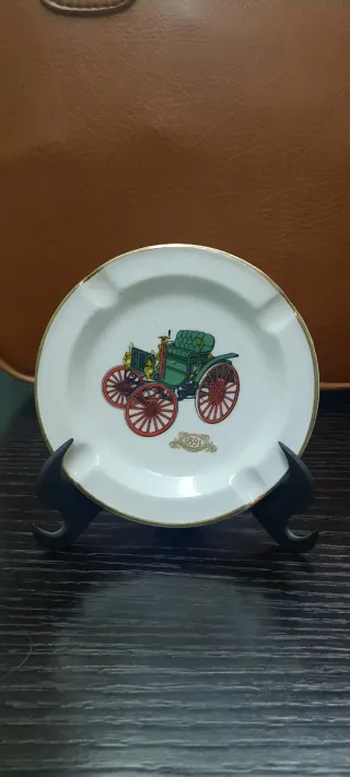 Cenicero de porcelana con diseño de coche antiguo. - Detalle de coche de 1891. - Borde dorado. - Marca: Porcelanas Sanbo.