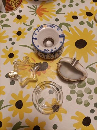 Conjunto de varios ceniceros decorativos. Todos 10€. Por separado a 2 y 3€ - Cenicero de cerámica con diseño azul y blanco. - Cenicero de cristal con forma de estrella. - Cenicero de cristal redondo. - Cenicero con forma de concha marina.