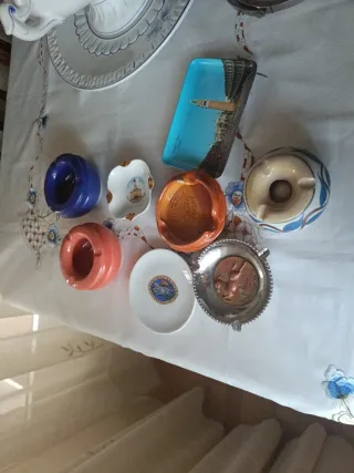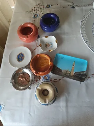 Conjunto variado de ceniceros de diferentes materiales y diseños. - Cenicero redondo de cerámica naranja. - Cenicero azul de cerámica. - Cenicero pequeño blanco con detalles dorados. - Cenicero de cerámica naranja con inscripciones. - Cenicero de metal plateado con relieve. - Cenicero cilíndrico de cerámica con diseño. - Cenicero rectangular con imagen de Venecia.