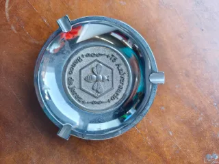 Cenicero metálico conmemorativo del 75 aniversario del Banco de Jerez. Presenta un diseño circular con un hexágono central que contiene la figura de una abeja. NUEVO - Diseño conmemorativo. - Acabado metálico brillante. vintage restaurado talla ropa mudanza Salón comedor retro Nike deporte clásico mueble diseño viaje colegio espejo regalo regala chollo cortinas lámpara mochila mesillas mesa Iphone televisor coche bicicleta Pandora zara LeroyHistoria prensa periódicos estudiante periodismo televisión Mudanza radio Revista arte Fotografía flash cámara vídeo cassette cinta Objeto,.