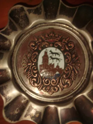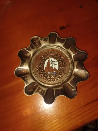 Cenicero decorativo con diseño de Bilbao. - Fabricado en alpaca. - Presenta un escudo con motivos de la ciudad.