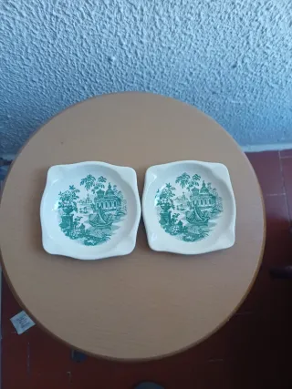 Conjunto de dos ceniceros vintage con diseño de Cartuja de Sevilla. - Diseño detallado. - Diámetro aproximado de 10 cm. Se trata de un cenicero vintage de La Cartuja de Sevilla (Pickman, España). Es una pieza de colección con un diseño paisajístico de estilo oriental. El diseño está decorado en color verde sobre fondo blanco. Presenta bordes festoneados. La fábrica de loza La Cartuja Pickman fue fundada en Sevilla en 1841.