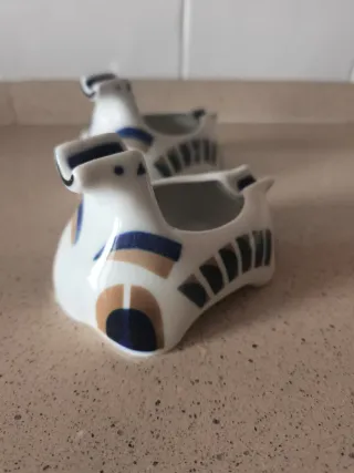Figura decorativa de Sargadelos con diseño de cenicero. - Cerámica blanca con detalles en azul y ocre. - Diseño inspirado en una figura futurista o de nave espacial. 20€/ud