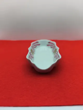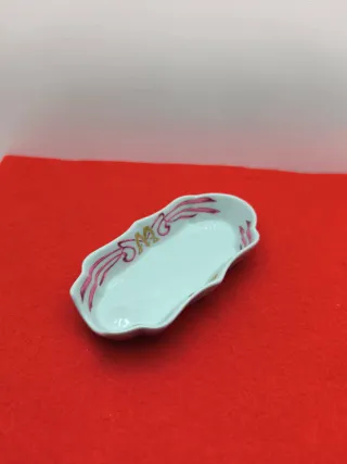 Cenicero vintage del restaurante Maxims. Presenta un diseño ovalado con un borde ondulado y una decoración de cintas en color rosa y dorado. - Diseño ovalado. - Borde ondulado. - Decoración de cintas. -Solo se realizan envíos