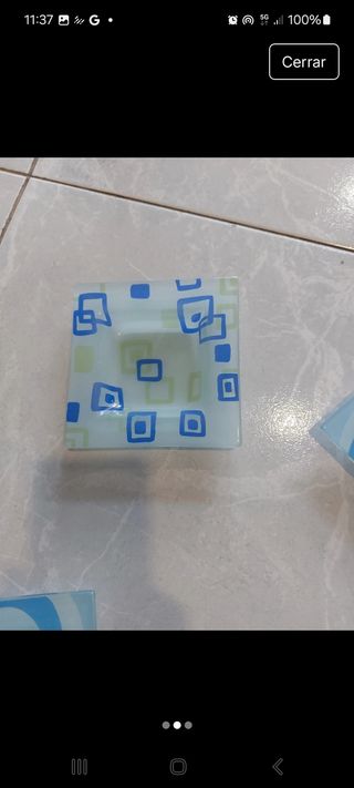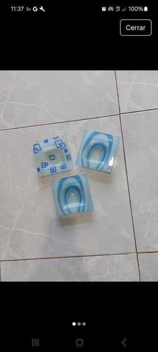 Conjunto de tres ceniceros cuadrados con diseños. - Diseño de cuadrados azules y verdes. - Diseño de círculos concéntricos azules. - Diseño de círculos concéntricos azules. - Medidas 12 x 12 cm