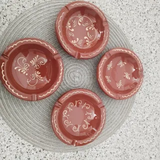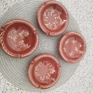 Conjunto de cuatro ceniceros de cerámica con un diseño decorativo. - Fabricados en cerámica de color terracota. - Cada cenicero presenta un patrón decorativo en blanco. - Borde ondulado con detalles. - Diseño artesanal.