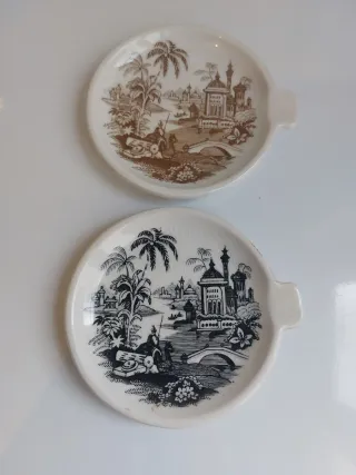 Conjunto de dos platitos o ceniceros de la marca Pickman. Presentan un diseño clásico con escenas orientales. - Dos unidades. - Diseño con paisaje y palmeras. 10 cms diametro