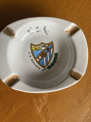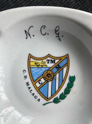 Cenicero antiguo grande de cerámica con el escudo del CD Málaga. Un detalle para coleccionistas o aficionados del equipo. - Diseño del escudo del CD Málaga. - Inscripción manuscrita 'N. C. C. G.' en el interior.