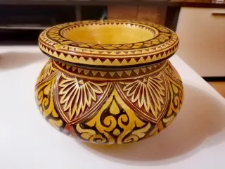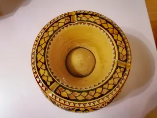 Cenicero de cerámica con un diseño intrincado y colores cálidos. - Decoración tallada a mano. - Tonos ocres y marrones. - Borde decorado con motivos geométricos. Cerámica hecha a mano con firma del autor en la base interior. Función como cenicero pero puede ser de adorno. Compuesto por dos piezas. En perfecto estado sin rajas ni desconchones. #ceramica, #vintage, #cenicero