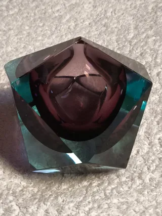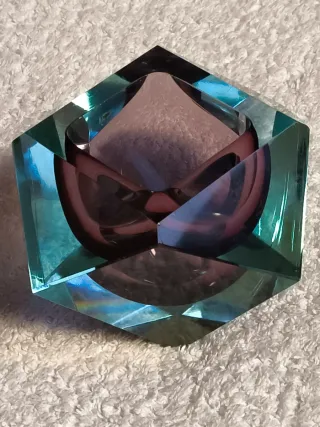 Elegante cenicero de cristal vidrio Murano sumergido con un diseño facetado y un bonito degradado de color azul turquesa y morado. Material: Cristal de Murano (Italia) Técnica: Sommerso Peso: 805 gr ver ultima foto Color: Azul turquesa y morado Diseño: Facetado Forma: Poliédrica exterior (dodecaedro) e interior redondo . Original y llamativo por su forma, color y composición. Nuevo sin uso alguno y perfecto.Totalmente para coleccionista. Hago envíos.
