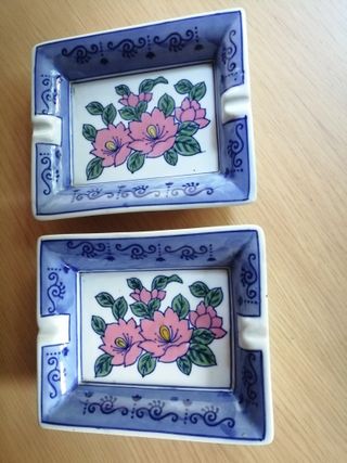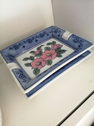 Conjunto de dos ceniceros de cerámica con un bonito diseño floral. 2 ceniceros rectangulares de cerámica, con un diseño floral. Son dos piezas, ideales para decorar o usar. Perfecto estado. Color Azul y Rosa Material Cerámica Medidas Anchura 20 cm Altura 3 cm Profundidad 17 cm