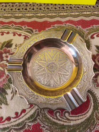 Preciosa cenicero de alpaca antigua. Es un objeto único y con detalles cuidados. - Material: Alpaca - Estilo: Vintage - Diseño: Circular con detalles grabados
