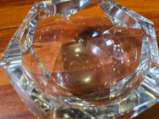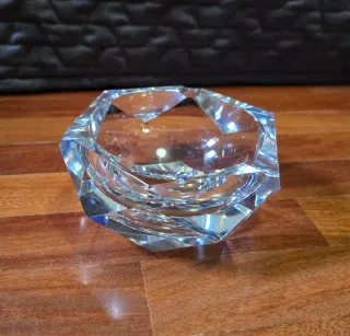 Preciosa pieza de cristal tallado. Ideal para decoración o coleccionistas. - Cenicero giratorio con cajita de música base de cristal facetado. - Presenta un diseño elegante y sofisticado. - La parte superior es de cristal transparente con un detalle central. - Incluye una base de terciopelo rojo. _Tiene una pequeña raja pero funciona.