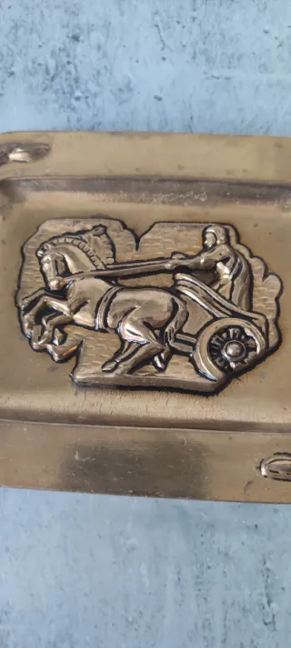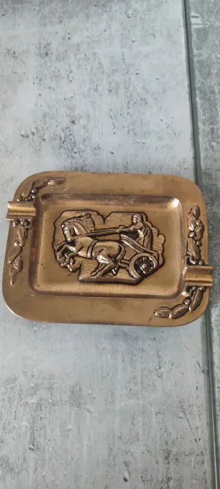 Cenicero decorativo con un diseño clásico. - Material: Bronce. - Motivo: Carro romano con auriga.