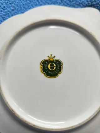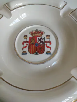 Elegante cenicero de porcelana con un diseño octogonal y detalles dorados. - Centro decorado con un escudo de España. - Borde con motivos florales en dorado. - Acabado brillante. 16'2cm como se ve en la foto.