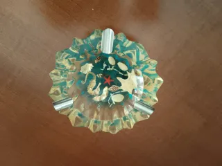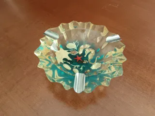 Cenicero vintage con un diseño inspirado en el mar, que evoca la década de los 60. - Decoración con elementos marinos como estrellas de mar, caballitos de mar y conchas. - Material de resina transparente con detalles en tonos turquesa y dorado. - Borde ondulado con soportes metálicos para cigarrillos.