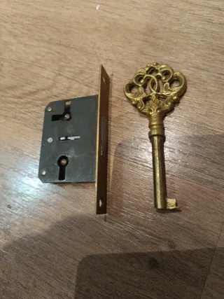 Cerradura antigua con llave de laton ideal para puerta de armario funcionando Medidas mecanismo embutir cerradura 3,5 cm largo 5 cm alto 0,8 mm. Ancho
