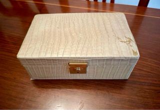 No es el de imitación, es el auténtico!Antiguo Joyero piel con textura de cocodrilo, comprado en la fábrica de Ubrique a finales 60’s con señales del paso del tiempo sin llave, no cierra bien del todo, se abre aparentando y hacia la derecha - Acabado en tono beige claro. - Cerradura frontal dorada (la llave no la tengo) - Diseño clásico y atemporal. Medidas joyero 20x13x7 cm En buen estado teniendo en cuenta el paso del tiempo. Hago descuento si coges mas cosas de mi perfil.