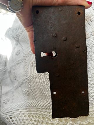 Pieza de cerradura antigua, de fabricación artesanal. Presenta un diseño robusto y detalles de época. - Placa metálica cuadrada con ojo de cerradura. - Mecanismo de cierre visible. - Mango o palanca de arrastre integrado.