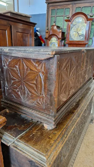 Precioso arcón antiguo de madera roble con un intrincado tallado. - Diseño con motivos geométricos y florales. - Cerradura metálica decorativa. - Base con patas torneadas. Para restaurar Alto : 54 largo : 127 ancho : 50 Teléfono: 636 20 48 47