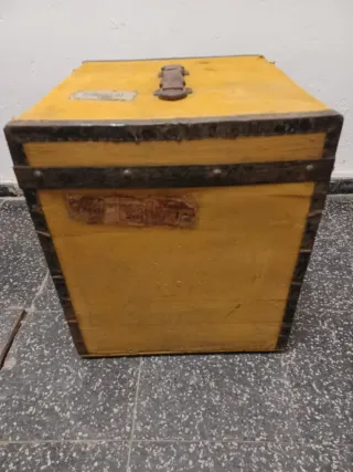Caja antigua de muestrarios con asa y cerradura. - Color amarillo. - Bordes reforzados con metal. - Asa de cuero. - Cerradura con candado. -medidas . 50×45×50