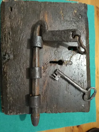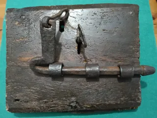 Cerradura de forja antigua, probablemente de los siglos XVIII o XIX. Con pasador completo y trabas. Aún sobre el resto de la puerta de madera original, con sus clavos, forjados y mecanismo, la llave no es de la cerradura, está incluida. - Mecanismo de cerrojo. - Soporte de metal forjado. - Base de madera oscura.
