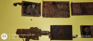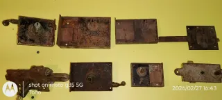 Conjunto de varias cerraduras antiguas, con un diseño robusto y característico de épocas pasadas. - Fabricadas en metal con acabado oxidado. - Mecanismos visibles y manillas. - Ideales para proyectos de restauración o decoración vintage.