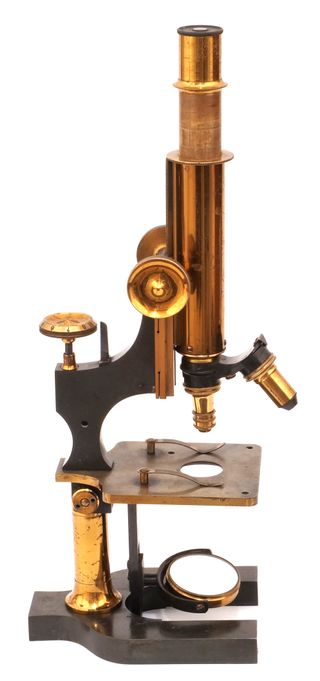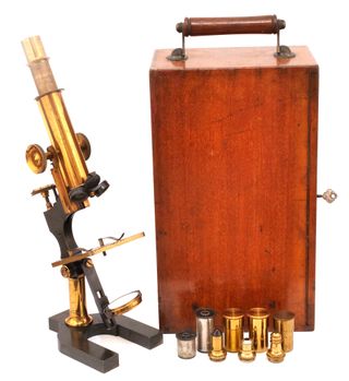 Magnífico microscopio antiguo fabricado en Londres por Watson&Sons a finales del s.XIX. Pertenece al modelo B de la serie "Edinburgh", la que seguramente le dió más fama y que culminó con el modelo Royal. El microscopio está un un magnifico estado y va acompañado por un extraordinario conjunto de accesorios que incluyen 3 objetivos del propio fabricante, 2 oculares (uno fabricado por Leitz) y una torreta doble intercambiadora de lentes. El conjunto está alojado en una bonita caja de caoba que conserva la cerradura operativa con la llave original.