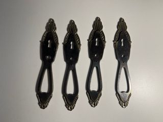Conjunto de cuatro bocallaves de estilo antiguo, con un acabado en bronce que evoca un aire clásico. - Diseño ornamental. - Abertura para cerradura. - Orificios para fijación.