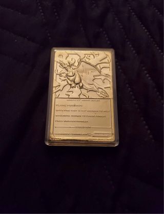 Charizard con acabado chapado en oro, inspirada en Pokémon. Burger king promo - Diseño detallado de Charizard. - Acabado metálico dorado.