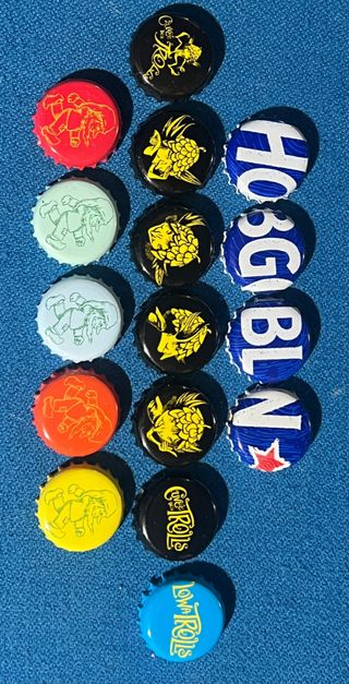 Conjunto de chapas de cerveza coleccionables. - Chapas de diferentes colores: rojo, verde claro, azul, amarillo, negro y azul claro. - Diseños variados con ilustraciones y texto. - Algunas chapas muestran texto como GINGER ROLLS y LOWA ROLLS. - Otras chapas presentan diseños de figuras y patrones.