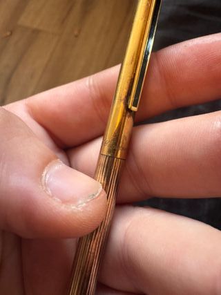 Elegante bolígrafo S.T. Dupont con un acabado chapado en oro. Un accesorio clásico y sofisticado. - Diseño con líneas finas. - Clip metálico. - Acabado dorado brillante.