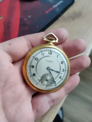 Elegante reloj de bolsillo antiguo de la marca suiza Courbet Watch. Esfera: Color crema con números arábigos claros y agujas estilo breguet en azul cobalto. Incluye subdial de segundero a las 6. Caja: Acabado chapado en oro con un grabado geométrico único en la tapa trasera. Maquinaria: Movimiento mecánico de carga manual con 15 rubíes, muy limpio y con una decoración de rayas "Côtes de Genève". Estado: Buena conservación estética, tanto de la caja como del cristal, funciona correctamente.