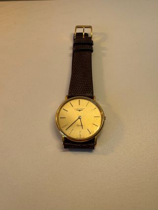 Longines Quartz vintage chapado en oro (años 80) • Marca: Longines • Modelo: Quartz vintage • Ref. esfera: 978 SWISS 6404 • Nº de serie: 20922180 • Año aprox.: años 80 • Movimiento: Longines L978.2 (cuarzo suizo) • Funcionamiento: correcto • Caja: chapada en oro • Fondo: acero inoxidable • Esfera: champán, diseño minimalista • Cristal: con marcas de uso • Correa: piel marrón (no original) Reloj fino y elegante, ideal como reloj de vestir o para colección. Se vende tal como se ve en las fotos.