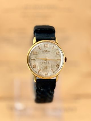 reloj de pulsera vintage Dogma Prima para hombre, fabricado en Suiza en los años 1950-1960. Este modelo clásico combina elegancia retro y fiabilidad mecánica. Características principales: • Marca / Modelo: Dogma Prima • Origen: Fabricado en Suiza (Swiss Made) • Época: Años 1950-1960 • Movimiento: Mecánico de cuerda manual, con inscripción “Ancre 15 Rubíes” en la esfera, garantizando precisión y durabilidad • Caja: Redonda, chapado en oro de 10 micras, fondo de acero inoxidable atornillado para mayor resistencia • Diámetro: ~37 mm • Esfera: Acabado texturizado tipo sol (sunburst), números arábigos e índices aplicados, pequeñ