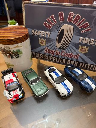 Set de 4 autos a escala y una chapa decorativa estilo vintage. - Incluye 4 modelos de autos a escala. - Chapa con diseño Get a Grip! y temática de neumáticos. - Estilo retro y decorativo.