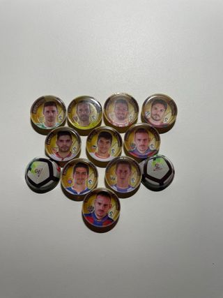Colección de chapas de fútbol de Cheetos. Incluye jugadores como Benzema, Iniesta y Casillas, además de escudos de equipos. - Chapas de colección. - Diseño circular con imágenes de jugadores y escudos. - Promoción de Cheetos. Todos tres euros