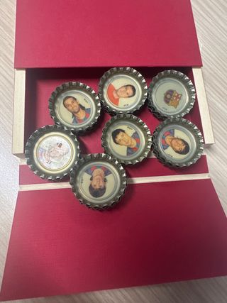 Se venden a 0,5€ la ud. Envío ordinario por 1€. Envío protegido son de tamaño grande más que una moneda de 2€. Colección de chapas de cerveza con cromos de futbolistas. - Cada chapa incluye un cromo de un jugador. - Diseños variados de equipos y jugadores.