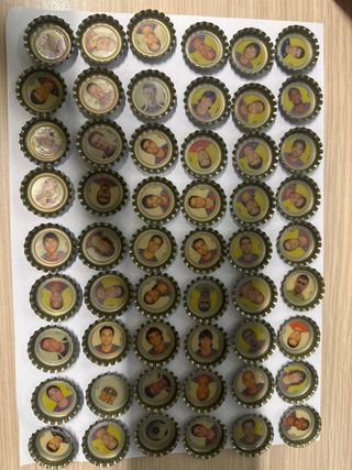 Colección de chapas del Real Madrid. - Incluye jugadores históricos. - Diseños variados con números y escudos. -44 chapas.