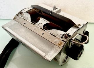 PS850--- 20x10x10 CMS, PESO 850 GRS, CHAPA GALVANIZADA CON REMACHES, TAPA CON CIERRE AUTOMÁTICO, A LOS LADOS TIENE DOS RUEDAS DE PLÁSTICO QUE HACEN GIRAR EL MECANISMO INTERIOR, UNA DE ELLAS TIENE UN BLOQUEO HECHO CON UNA MONEDA DE ZINC, EL MECANISMO CENTRAL ES GIRATORIO Y TIENE COMO UNOS COMPARTIMENTOS SEPARADOS CON UN CÁNCAMO, LA CORREA ES UN SIMPLE CINTURÓN, NO SE PARA QUE PUEDE SERVIR ... PESCA????, SEGÚN FOTOS - Material metálico. - Diseño único.