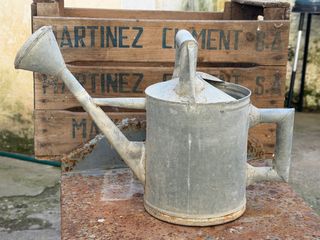 Pequeña regadera antigua fabricada en chapa galvanizada. Un objeto con encanto para coleccionistas o decoración. Cuerpo depósito: 25cm x 20cm diametro Total: 28cm alto x 40cm - Material: Chapa galvanizada.