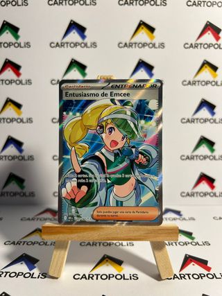 Carta Pokémon Entusiasmo de Emcee en perfecto estado. Es una carta en español con un arte completo, perfecta para coleccionistas. 🎁 Extras incluidos en el pedido: - Pegatinas de tus Pokemon favoritos!✨ - Chapas hechas a mano🤩 - Cartas basicas o holograficas de regalo - Toploader rigido y funda protectora🛡️ 📦 Envío rápido y protegido: Nos aseguramos de que cada carta viaje en condiciones óptimas, usando materiales de calidad para su conservación durante el envío. NO LEER: Pokemon, Full art, SIR, AR, Prismatic, pikachu, eevee, rayquaza, evolving skyes, black volt, white flare, tcg, dragon ball, one piece, album