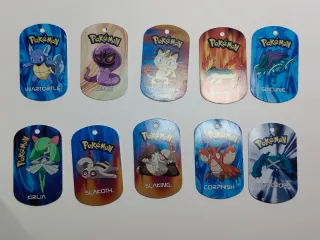 Colección de 10 chapas metálicas de Pokémon. - Incluye personajes como Wartortle, Arbok, Meowth, Quilava, Suicune, Kirlia, Slakoth, Slaking, Corphish y Metagross. - Diseño con el logo de Pokémon y el nombre de cada personaje. Todas 20€. 1 chapa 3€.