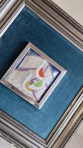 Contemporáneo cuadro original, pintado con mixtas tècnicas y òleo sobre chapa metálica, presentado tres pájaros coloridos estilizados. Enmarcado con marco dorado oscuro de madera y paspartú de Terciopelo color turquesa.Firmado: Ferrer. Medidas marco exterior: 33,5x33,5 cm.Pintura interior:10x10 cm SOLO ENVIOS!( Elegir Correos #cuadro #òleo #lienzo #esmaltado #dorado #marcoMadera #pájaros #antiguo #artesanal #bodegon #retrato #lienzo #pintura #arte #oro #palomas #despacho #casa #salon #comedor #pasillo #decoraciòn #escritorio #despacho #consola #bureau #rural #alacena #vitrina #mueble #decoracion #clássico #terciopelo #turqueza