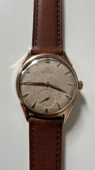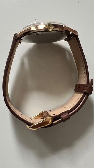 Omega Seamaster Automatic Vintage | c. 1960s Vendo este Omega Seamaster automático de mi selección. El dress watch por excelencia de los años 60. Esfera impoluta — dial plateado con índices aplicados dorados, agujas dauphine, "Seamaster" en cursiva. Todo completamente original: corona firmada Omega, cristal plexi con mínimos arañazos de uso. Caja chapada en oro de 34mm con el desgaste honesto propio de 60 años de historia (brassing visible en bisel y asas — pátina auténtica, no defecto). Calibre automático Omega de manufactura. Funcionamiento perfecto. ━━━━━━━━━━━━━━━━━━━━━━━━━━━━━━ INCLUYE · Reloj original · Caja y correa