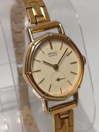 Elegante reloj Seiko con un diseño clásico y sofisticado. - Esfera de color crema. - Brazalete y caja base acero chapado íntegramente en oro - Movimiento de cuarzo. - Muy leves señales normales de uso. - N° serie 101.233.