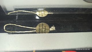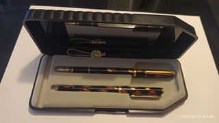 Elegante set de escritura que incluye una pluma y un bolígrafo, ambos con detalles chapados en oro de 23 quilates. Presentados en un estuche. - Pluma. - Bolígrafo. - Estuche de presentación. Lleva mucho tiempo sin ser utilizado por lo que hay que cambiar los cartuchos y posiblemente limpiar la pluma.