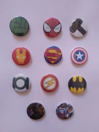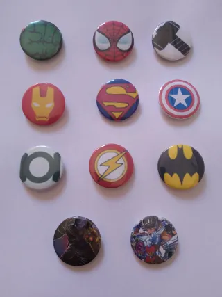 Lote de chapas o imanes con diseños de superhéroes icónicos. Tamaño 32 mm - Incluye personajes como Hulk, Spider-Man, Iron Man, Superman, Batman, Capitán América, Linterna Verde, Flash, Batman, Thanos y los Caballeros del Zodiaco. - Diseños variados y coloridos.