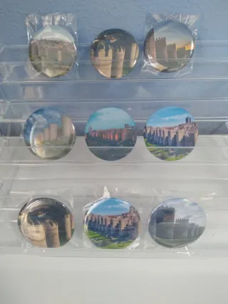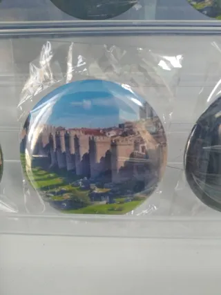 Lote de chapas con imágenes de la histórica Muralla de Ávila. Cada chapa muestra una vista diferente de esta emblemática fortaleza. - Diseño circular. - Imágenes de la muralla y el paisaje circundante. - gran tamaño 58mm - precio por unidad - también en formato espejo - espejo 1'50€ unidad - imán de nevera 1'50€ unidad - descuento por cantidad