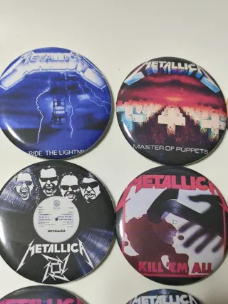Conjunto de chapas con diseños de la banda Metallica. - Incluye 12 chapas. - Diseños variados de álbumes y logos icónicos. - Ride the Lightning - Master of Puppets - Jump in the Fire - ...And Justice for All - Kill 'Em All - Creeping Death - The Black Album (Serpentina) - S&M - Garage Inc. - St. Anger - Load - ReLoad - Chapas de gran formato, - 58 mm consultanos